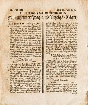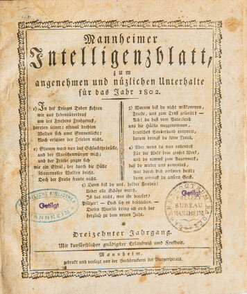 Zur Finanzierung der Krankenversorgung betreibt - mit kurfürstlicher Erlaubnis - das katholische Bürgerhospital seit 1789 eine Druckerei und gibt ab 1790 das "Mannheimer Intelligenzblatt" heraus. Zunächst erscheint das Anzeigenblatt wöchentlich, dann zweimal die Woche. Später wird der Inhalt durch kurze, unkommentierte Nachrichten ergänzt. Unter wechselnden Titeln erscheint es bis 1944.