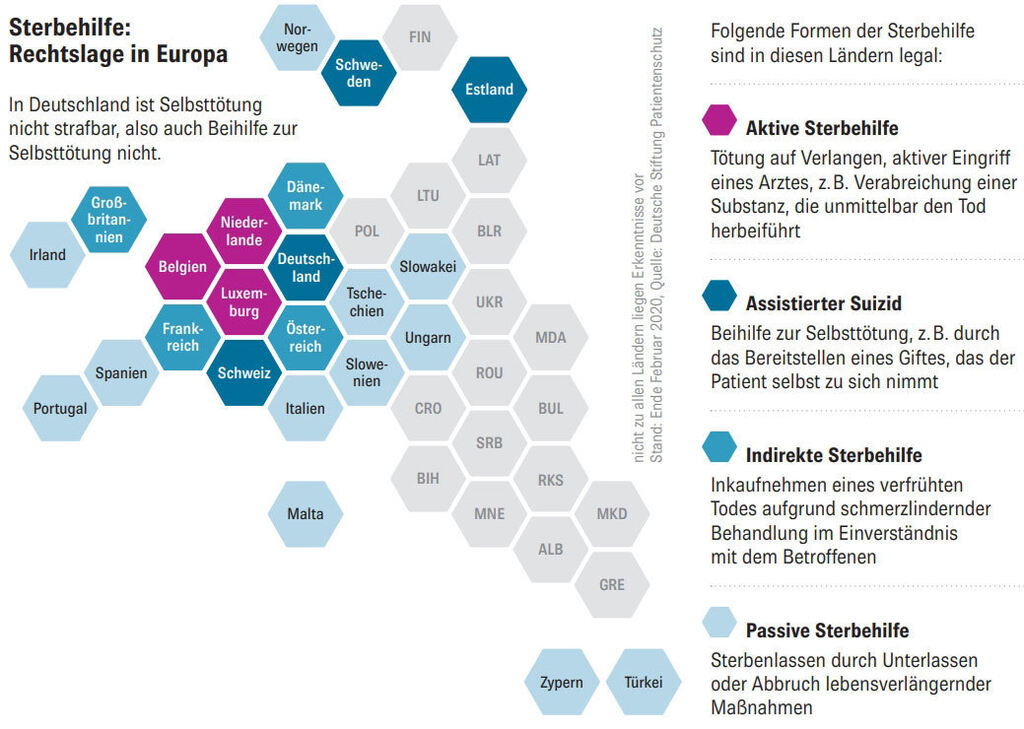 Das Sterbehilfe-Verbot verstößt gegen das Grundgesetz. In einem enorm weitgehenden Urteil arbeiten sie ein Recht des Einzelnen auf selbstbestimmtes Sterben heraus. „Dieses Recht schließt die Freiheit ein, sich das Leben zu nehmen“, sagt Gerichtspräsident Andreas Voßkuhle – und sich dafür Hilfe bei Dritten zu suchen. Ohne diese Möglichkeit würde das Selbstbestimmungsrecht eines Menschen mit Sterbewunsch nach Auffassung der Richter „faktisch weitgehend entleert“. Die Richter erklären Paragraf 217 deshalb für nichtig. Anders als in den Niederlanden, Belgien und Luxemburg bleibt aktive Sterbehilfe – also die Tötung auf Verlangen – aber verboten.