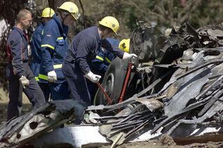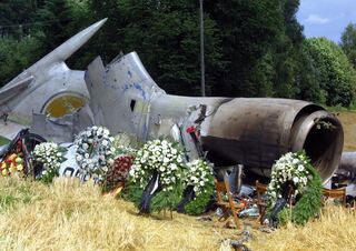 Polizeibeamte untersuchen am 2.Juli 2002 bei Überlingen am Bodensee die Wrackteile einer abgestürzten Tupolew...