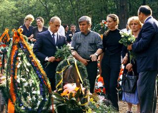 Der russische Präsident Wladimir Putin (l.) und der baschkirische Präsident Murtasa Rachimow (r.) unterhalten sich am 8.Juli 2002 auf dem Friedhof in Ufa mit Angehörigen der Opfer des Flugzeugabsturzes am Bodensee.