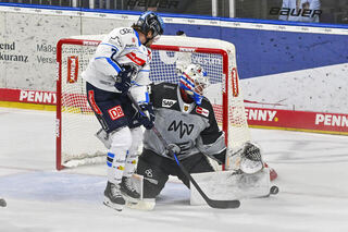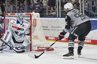 Ingolstadts Peter Abbandonato (Nr. 98) vor dem Tor von Mannheims Johan Mattsson (Nr.33). Nach zwei Dritteln liegen die Adler 0:1 zurück.