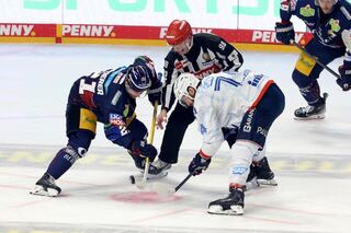 Lean Bergmann (Eisbaeren Berlin #10), Arno Tiefensee (Adler Mannheim #30), und Fabrizio Pilu (Adler Mannheim #68).