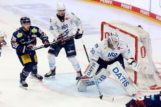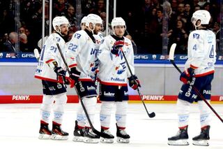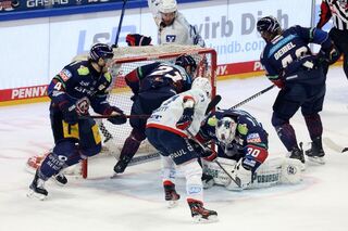 Jake Hildebrand (Eisbaeren Berlin #30), Adam Smith (Eisbaeren Berlin #4), Korbinian Geibel (Eisbaeren Berlin #40) und Kais Bennett (Adler Mannheim #21).