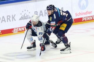 Manuel Wiederer (Eisbaeren Berlin #21) und Ryan Macinnis (Adler Mannheim #74) während dem Spiel.