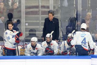 Mannheims Co-Trainer Curt Fraser und die Mannheimer-Spielerbank.