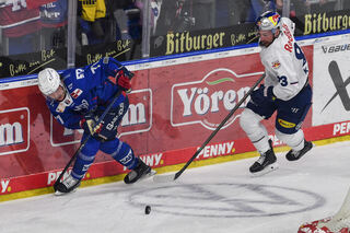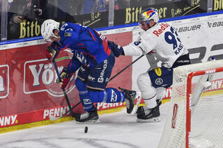 Mannheims Yannick Proske (Nr.27) gegen Muenchens Mathias Niederberger (Nr.35) beim Spiel in der Penny DEL, Adler Mannheim - EHC Red Bull Muenchen. Foto © PIX-Sportfotos *** Foto ist honorarpflichtig! *** Auf Anfrage in hoeherer Qualitaet/Aufloesung. Belegexemplar erbeten. Veroeffentlichung ausschliesslich fuer journalistisch-publizistische Zwecke. For editorial use only.