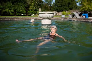 Ina Gräfin von Schaesberg (vorne, 87) und Annemarie Gräfin Beissel von Gymnich (79) kann die Wassertemperatur von zehn Grad im Schlossbrunnen nicht schrecken.