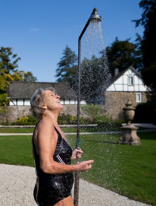 Ina Gräfin von Schaesberg (87) nimmt nach dem Bad im kalten Schlossbrunnen eine Dusche.