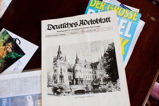 Eine ältere Ausgabe des "Deutschen Adelsblatts" auf einem Tisch auf Schloss Ehreshoven.