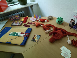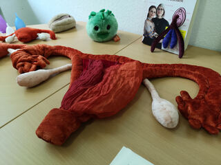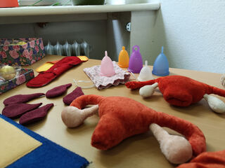 Etwas anderes Unterrichtsmaterial: Menstruationstassen und Gebärmütter als Stofftiere.