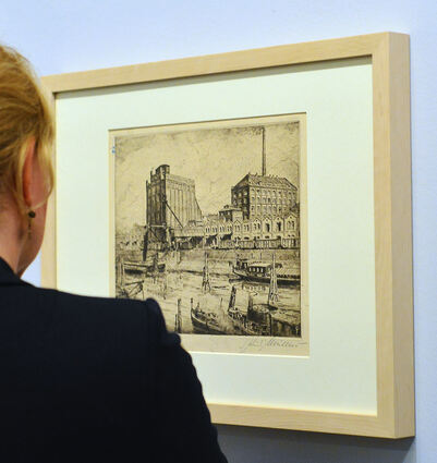 Radierung von 1930: Mühlauhafen, Kauffmann-Mühle von Rudi Müllers.