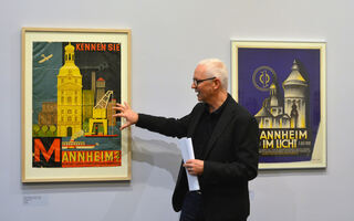 Kurator Dr. Thomas Köllhofer mit den Plakaten: "Kennen Sie Mannheim" von Karl Bertsch Farblithographie von 1929 und "Mannheim im Licht" (r.) von Binder (Vornamen und Lebensdaten unbekannt) Farblithographie von 1928.