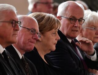Bundespräsident Frank-Walter Steinmeier, Bundestagspräsident Norbert Lammert, Bundeskanzlerin Angela Merkel und der Vorsitzende der CDU/CSU-Bundestagsfraktion Volker Kauder während der Totenmesse.