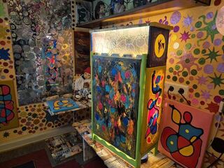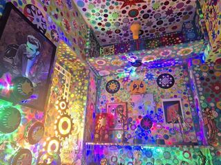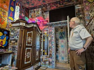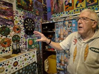 Auch der Kellerraum des 84-Jährigen ist mit bunten Glitzer-Klebern, Lichterketten und Figuren dekoriert.