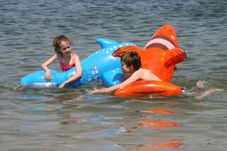 Rebecca und ihr Bruder Konstantin aus Rimbach toben mit ihren Gummifischen durch den Waidsee.