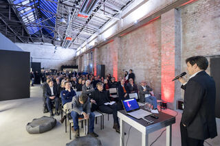 Beim Neujahrsempfang der Architektenkammer im Betriebswerk beim Tankturm sprechen Vorsitzender Jan van der Velden-Volkmann und Erster Bürgermeister Jürgen Odszuck zu den Gästen.