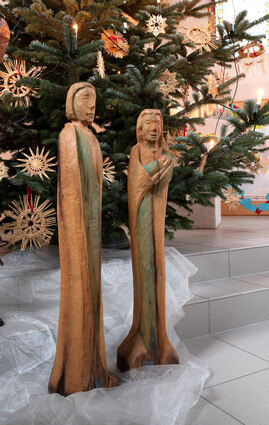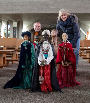 Bis zu einen Meter groß sind die Krippenfiguren in der Angelbachttaler Heiliigkreuz-Kirche, hier mit Berno Müller (Hauptautor) und Dorothea Burkhardt (Fotografin).