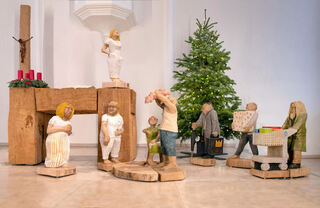Diese besonders bezauberndeWeihnachtskrippe der Kapellengemeinde in der Heidelberger Diakoniekirche (In der Plöck), die zeitgemäße Figuren und einen Obdachlosen (r.) als einen der drei Könige zeigt, hat der Bildhauer Michael Stadter mit einer Kettensäge geschaffen.