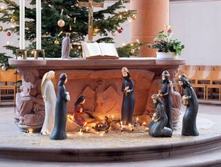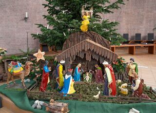 Farbenfroh zeigt sich die legendäre biblische Stallszene in der Edinger St. Bruder Klaus-Kirche.