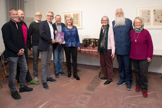 Landrat Stefan Dallinger (4.v.l.) präsentiert im Kreisarchiv den Krippenbildband Wunderbare Welt der Weihnachtskrippen im Rhein-Neckar-Kreis und in Heidelberg mit Autoren, Fotografin Burkhardt und Kunstschaffenden bzw. deren Angehörigen wie Wolfgang Maria Ohlhäuser (2.v.r.).