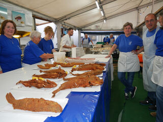 Knusprig gebackenen Fisch bietet das Team des Angelsportvereins Ilvesheim beim Fischerfest 2024 an.