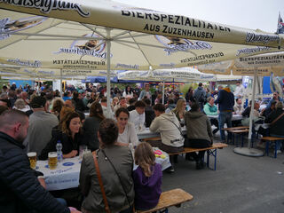 Auch die Bierbänke im Biergarten unter den großen Schirmen sind beim Fischerfest 2024 in Ilvesheim gut gefüllt.
