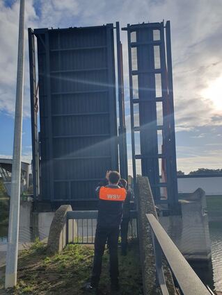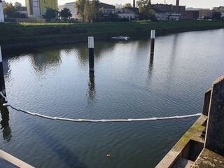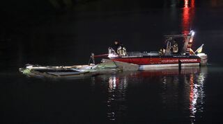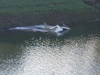 Das Steuerhaus des Binnenschiffs wurde abgerissen. Auch die beiden Autos, die sich zuvor auf dem Schiff befanden, sind über Bord gegangen.