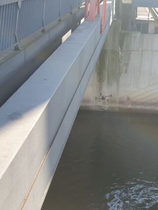 Ein Gutachter ist mit einer Drohne im Einsatz. Es wurde geprüft, wie stark die Schäden an der Diffenébrücke sind.