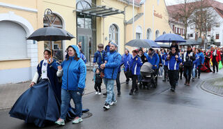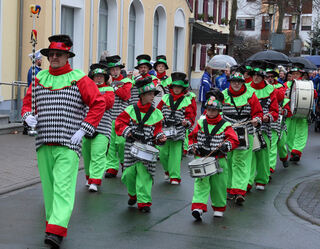 Der Spielmannszug der Freiwilligen Feuerwehr Brühl maschiert mit Musik zum Rathaus.