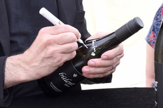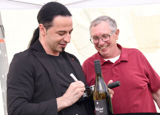 Beim überraschenden Wiedersehen mit seinem Mathelehrer Rolf Reidinger signiert er seine Flasche besonders freudig.