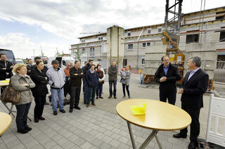 Mai 2014: Richtfest zum Neubaugebiet "Am alten Bahnhof", BGM Hoffmann (l.) und Klaus Eisert, I + E Generalbau, freuen sich. Bild: Lenhardt
