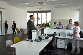 Hell, freundliche Farben, offen, das attestieren die Neulußheimer im September 2014 ihrem neuen Bürgerbüro im Anbau des Rathauses. Rechts Mitarbeiterin Sabine Wolff, Mitte Bürgermeister Gunther Hoffmann. Bild: Zeuner