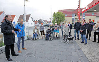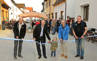 Im April 2015 wird die Friedrichstraße nach der Sanierung eingeweiht. Das Bild zeigt v.l. Jürgen Ebert, Bürgermeister Hoffmann, Lenja (3), Arno König und Rene Faul. Bild: Lenhardt
