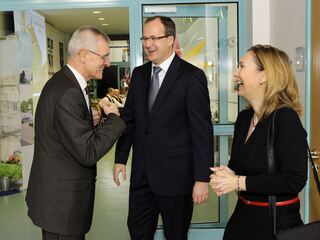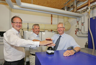 Im Mai 2015 nehmen Bürgermeister Hoffmann, Markus Sohn (Teamleitung Wärme Contracting) und Wolfgang Bühring (Geschäftsführer Stadtwerke Speyer) das Blockheizkraftwerk in Betrieb. Bild: Lenhardt