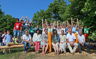Im Juni 2018 wird an der Lußhardtschule ein neues Spielgeräte eingeweiht: Reinhard Hoffmann (v.l.), Yvonne Gerlach, Carmen Führmann, Carina Schneider, Christiane Harz, BM Gunther Hoffmann und Werner Krauß, Bild: Lenhardt