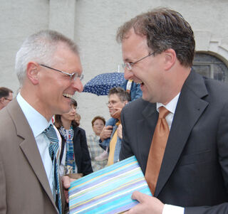 18. Mai 2008: Hockenheims OB Dieter Gummer (links) grautliert Hoffmann zum Wahlsieg. Bild: Schwerdt
