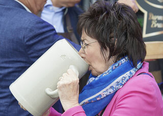 Bürgermeisterin Bärbel Schader trinkt aus dem Bierkrug.