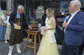 Fassbieranstich zur Eröffnung: Carsten Hoffmann vom Sponsor GGEW, Sonnenbotschafterin Charlotte I. und Wolfgang Koehler von der Brauerei Bräustübl.