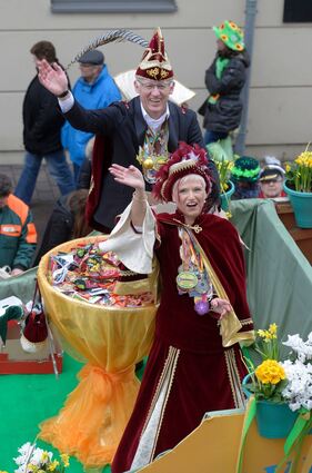 Bürstadts Prinzenpaar Silke I. und Erhard I. grüßen die rund 8 500 Zuschauer.