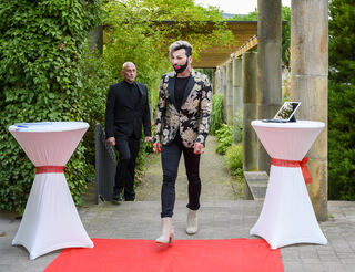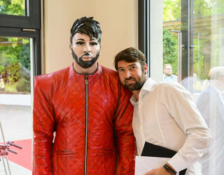 Stephan Alfter steht neben einer lebensgroßen Figur des Designers.