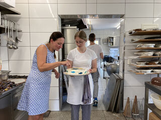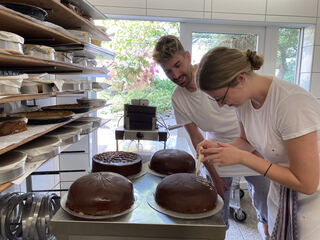 Konditormeister Michael Oberfeld und Konditorin Maren Straub beim Verzieren einer Torte.