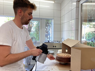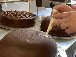 Konditormeister Michael Oberfeld kuvertiert eine Torte.