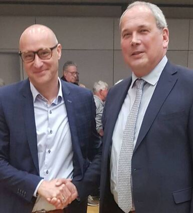 Im April wurde Kämmerer Andreas Emmerich (l.) zum Bürgermeister der Großen Kreisstadt Waghäusel gewählt. Emmerich tritt in Waghäusel die Nachfolge von Thomas Deuschle (r.) an, der gut ein Jahr zuvor zum Oberbürgermeister der Großen Kreisstadt gewählt wurde. Mit Emmerich ging der Gemeinde nicht nur der Kämmerer, sondern auch der Bauamtsleiter verloren – seit Jahren sind die beiden Ämter in der Gemeinde verknüpft, was sich bewährt hat. Und die in der Zukunft eine Fortsetzung finden wird, denn mit Andy Strittmatter hat die Gemeinde einen Nachfolger gefunden, der gleichfalls beiden Bereichen vorsteht. Der Fachbeamte für das Finanzwesen war nach seinem Studium an der Verwaltungshochschule in Kehl bei der Großen Kreisstadt Hockenheim beschäftigt.