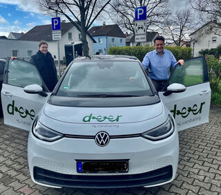 Ellen Schuler, Deer-Projektmanagerin Vertrieb, inspiziert mit Bürgermeister Stefan Weisbrod das zur Verfügung gestellte E-Fahrzeug. Der Einstieg ins E-Carsharing ist für die Gemeinde ein sichtbares Zeichen auf dem Weg hin zur Klimaneutralität, immerhin standen im vergangenen Jahr 300 000 Euro für Photovoltaik im Haushaltsplan und werden Umwelt-schutzmaßnahmen gefördert.