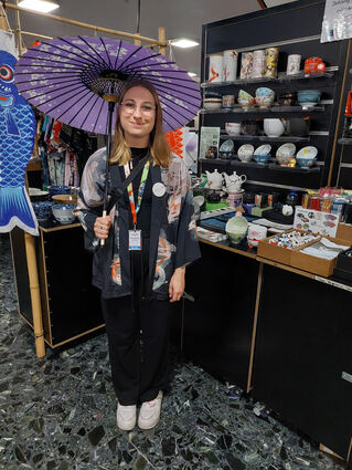Maria verkauft Ware aus Japan. Besonders gut kommt GEschirr an. Und Schirmchen beim Regenwetter.