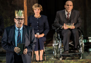 Lukas Bärfuss' Auftragswerk "Der Elefantengeist" spielt in einer utopischen Zukunft, in der sieben Archäologen in den Ruinen Bonns den Kanzerbungalow entdecken. Dort herrscht ein Geist, der längst vergessene Machttriebe wiedererweckt. So verwandeln sich (von links) Matthias Breitenbach als Dr. Matthias, Viktoria Miknevich als Dr. Viktoria, Martin Weigel als Dr. Martin gegen Ende des Stücks in Wiedergänger von Alt-Bundeskanzöer Helmut Kohl, Angela Merkel und Wolfgang Schäuble. Foto: Andreas Arnold/dpa