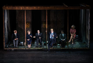 Starkes Ensemble (von links): Jacques Malan als Dr. Jacques, Viktoria Miknevich als Dr. Viktoria, Martin Weigel als Dr. Martin, Matthias Breitenbach als Dr. Matthias, Lazlo Branko Breiding, Dr. Lazlo und Johanna Eiworth als Johanna, sitzen auf der Bühne im Kanzlerbungalow. Vor allem die Schauspieler ernten nach der Uraufführung in Mannheim viel Applaus. Foto: Andreas Arnold/dpa