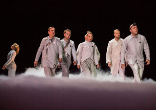 Anfangs sehen die sieben Archäologen noch klinisch rein aus und halten die Werte ihrer Gesellschaft nach der "Großen Einsicht hoch (von links): Die am meisten gefeierte Johanna Eiworth, als Johanna, Matthias Breitenbach als Dr. Matthias, Lazlo Branko Breiding als Dr. Lazlo, Viktoria Miknevich als Dr. Viktoria, Eddie Irle als Dr. Eddie und Martin Weigel als Dr. Martin gehen durch Bodennebel auf der Bühne. Im Kanzlerbungalow werden sie mehr und mehr korrumpert. Foto: Andreas Arnold/dpa