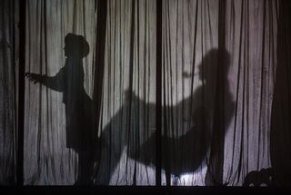 Zunächst tauchen der Altkanzler und seine Frau Hannelore nur als geisterhafte Schattenspiele auf. Foto: Christian Kleimner