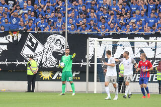 Der verletzte Waldhof-Spieler Benedikt Koep (Mitte, weißes T-Shirt) wollte sich unter die Waldhof-Fans in den Gästeblock mischen.